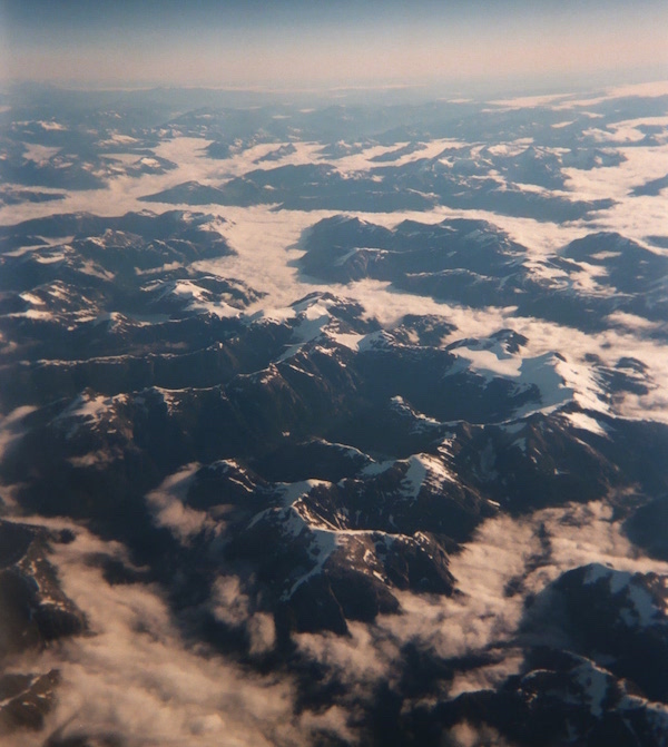 Outside of Juneau, the cloud bank disappears and I can see rugged mountain ranges. Ten minutes later, silvery-green patches with interesting striations start to appear… glaciers!