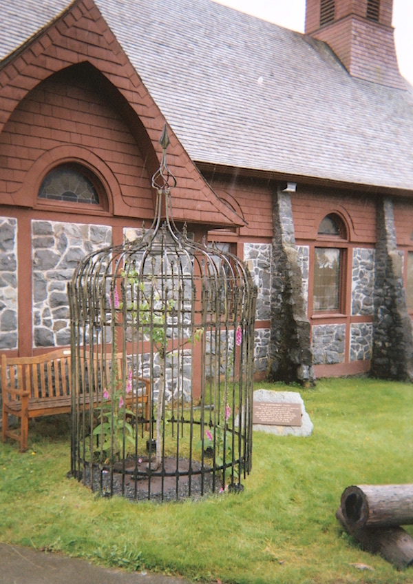 The other unusual feature is a Victorian style cage in the side yard, containing a 5-foot tall tree. A nearby placard explains that this is the Glastonbury Thorn: “By legend, the walking staff of Joseph of Arimethea was planted in Briton during the first century. The shoot in the cage was planted here in 1999…it’s presence commemorates the work of Anglican missionaries carrying the gospel of Christ halfway around the globe.”