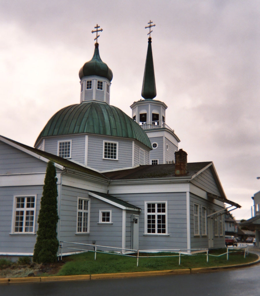 Built in 1844-48 from spruce logs faced with clapboard on the outside and lined inside with sailcloth for insulation and acoustics, it burned to the ground in a fire that took much of Sitka’s downtown in 1966. Nearly 100 Sitkans formed a bucket brigade to retrieve the relics inside before the church was completely lost. The large chandelier that hangs from the dome was rescued by a parishioner who stacked benches underneath the fixture until he could reach the chain to unhook it. He handed it to a pair of men standing below him, who carried it out of the church. It later took 6 men to carry the 300 pound piece to the Bishop’s House for storage.