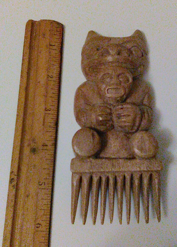I go shopping, and find that even the native art is mostly copy work. I had really wanted a totem pole, since Ketchikan has the largest collection of historical totems in the world, but I didn’t want a stock one, and the only one that looked like an original, and that I could afford, was unsigned. I treat myself to a berry picker – a stout wooden comb with a dimensional handle carved into Mother Bear.
