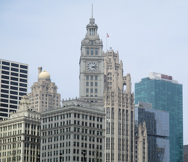 Wrigley Tower at center, Tribune Tower at right, Medina Club with the gold dome is at left.