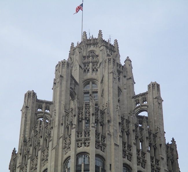 Next door to the Wrigley Tower is the Tribune Tower, marking the head of the Magnificent Mile. Designed by architects Hood and Howelle, it was built in the Gothic Revival style, inspired by the cathedral in Rouen, France. I commented on the flying buttresses being ornamental rather than structural, and the guide informed that Neo-Gothic and Gothic Revival buildings were intended to make Chicago look older than it is. The building was completed in 1925, replacing the original which was built in 1868 but destroyed during the Great Chicago Fire of 1871.
