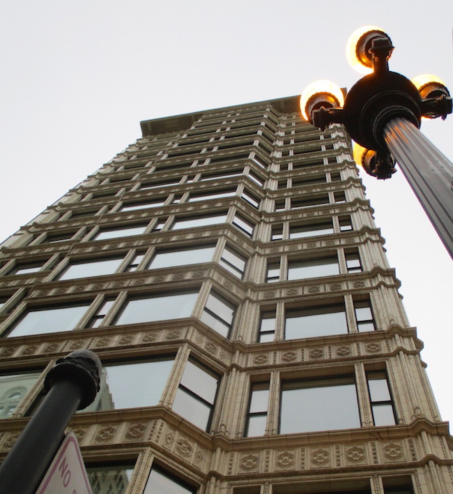 The Jeweler’s Building had an elevator (up to the 22nd floor) that would hold an automobile, which prevented diamond heists during the Capone era as well as giving the building the distinction of being the first office tower in Chicago with indoor parking. (The elevators were later discarded and the garages turned into office space). There was a speakeasy in one of the top turrets, the turrets also contained water tanks which would be utilized in the event of a fire. The dome at the top now houses an architectural showroom. The building was granted landmark status in 1994.