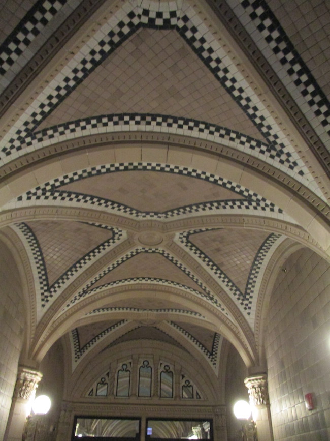 The Monroe Building was locked when I got there last night, so I could only photograph the lobby through a glass door. Designed by Holabird & Roche in 1912, it’s described as “an eclectic mix of Gothic and Italian Romanesque.” The tile work is Rookwood Pottery, one of the largest woman-owned businesses in the country at the time. It remains among the largest commercial installations of Rookwood tile in the US.