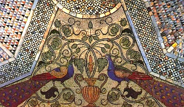 Marie reminds me to spend half of my time looking at the floor, where incredible mosaics and geometrics meet our every step. The floor is nearly as incredible as the ceiling. I reach down several times to touch the marble, the sardonyx, the lapis. The floor is much smoother than I expected, for it being made up of so many angular cuts of stone.