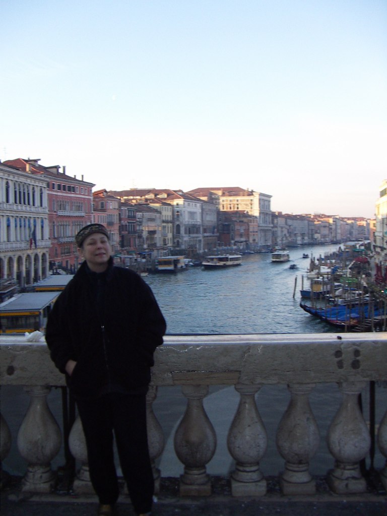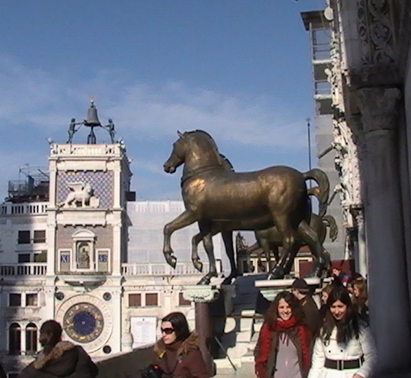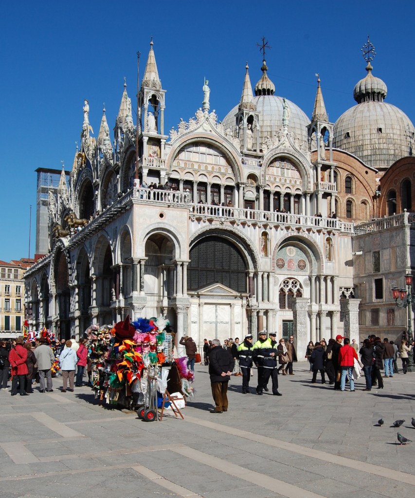I did not choose well when I opted out of going upstairs, which I later realized was the San Marco Museum — the Doge’s Banquet Hall which now houses tapestries, illuminated manuscripts, and on the balcony, the four bronze horses that you can see from the Square. But by that time I had nearly burned my retinas with the details of this place, and was pretty overwhelmed. I light candles for Dad and Chuck who both died last year. I note a rifle mounted in a glass case (which I would later find was an offering of thanks from a woman for the safe return of her husband from war). We exit the building and find relief for our retina-burned eyes in a clear, cloudless sky.