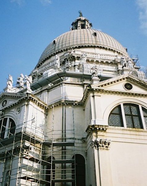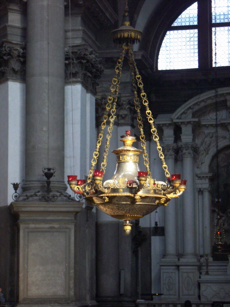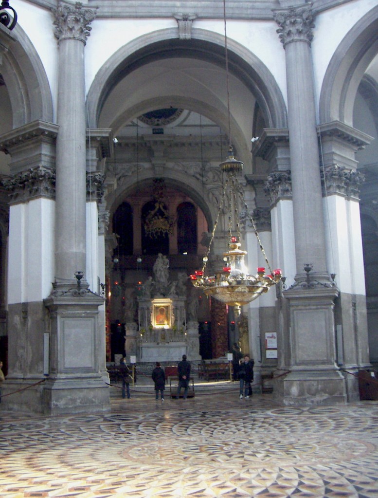 We visit the Cathedral of the Salute (Santa Maria della Salute) where I light a candle for Mischka, who also died last year (one of 10, it was a very bad year..) About half the outside of the dome is covered with scaffolding. It is also in sharp contrast to the Basilica, with its grey, unadorned interior, and its dome inset with glass panels, which fills the entire building with that beautiful Venetian light. It was built in 1630 by those thankful few who survived the Black Death that year.