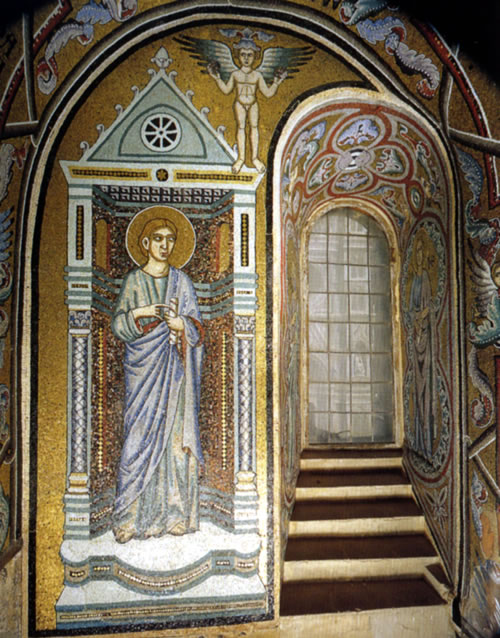 Major artistic work began on the interior of the Baptistery in 1202, including the mosaic floor which is described as “a spread of Oriental carpets” leading the devoted to the center baptismal font, marked now only by the scar of an outline of where it stood before it was dismantled in 1577. Most of the exterior architectural details were completed by the 14th century, just as restoration on the interior dome mosaics began – work that continued well into the 19th century.