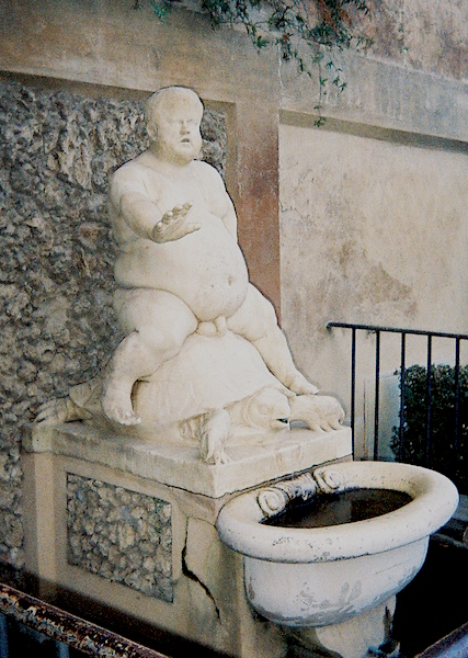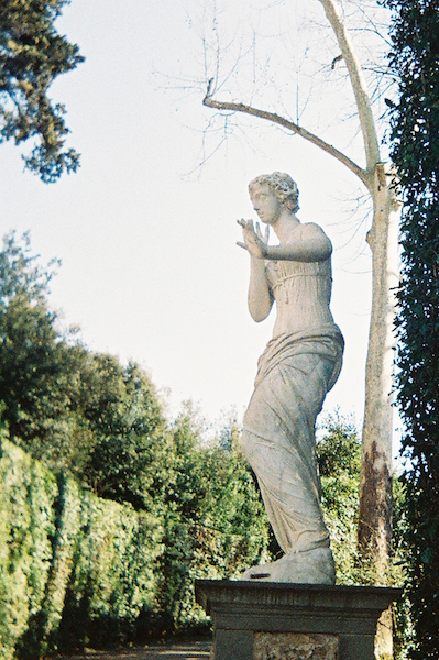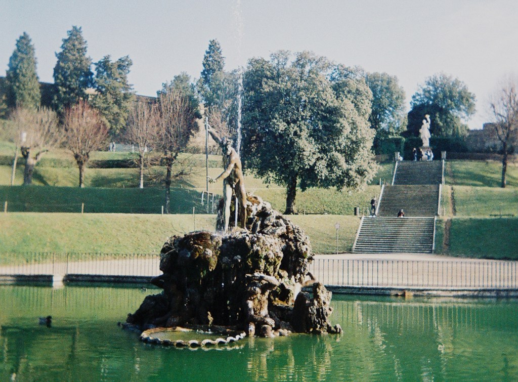 On my way back down the sloping grounds, I find a bench overlooking the Forcone Basin, a collection point for water used to irrigate the grounds. In the center stands a bronze Neptune, dating to 1571 and sculpted by Soldo Lorenzi. It was originally intended for a flower garden north of the Pitti Palace, but moved here here in about 1635. It was fairly common for artworks here to have been commissioned for specific places or events, and then later moved.