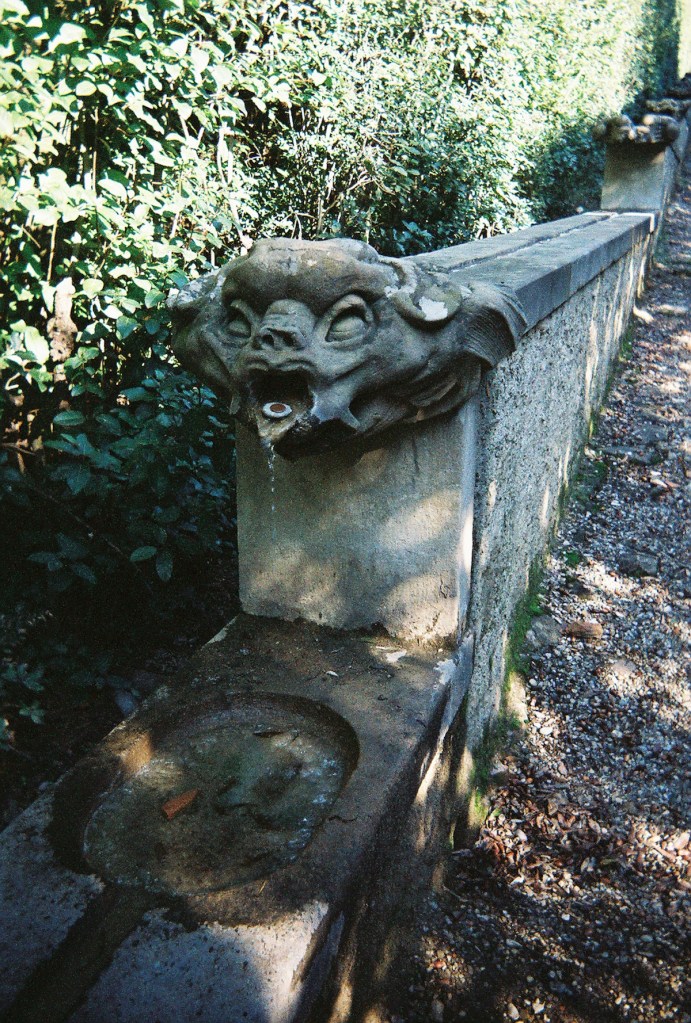 I return to the Mostaccini Fountain to video-capture the the sound of birds and running water. I walk the length of it, admiring the fantastical heads, of which no two are the same. It was built in the early 1600’s as a water source for birds, which were then hunted with nets.