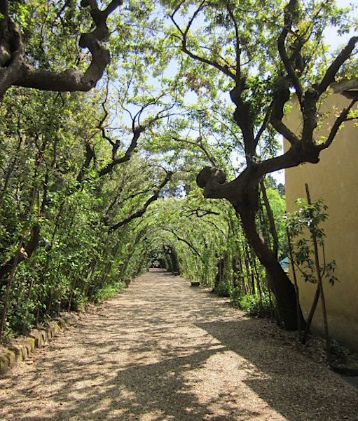 I wander through the olive and oak arbors that run the length and breadth of this garden, a feature I am exceedingly fond of. I rest for awhile on one of the rustic benches in one of these arbors, just to listen to the birds and relax my eyes in the dappled shade. There are so many songbirds here…