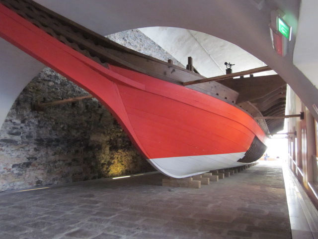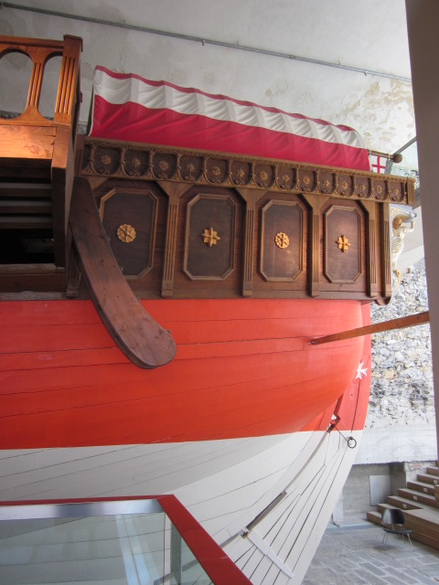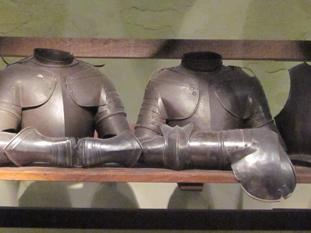 The ground floor, housed in what looks like another ancient building with low spreading curved ceilings which shape the room like a Quonset hut, is themed The Age of Oar. There are banks of armor, including Morion helmets, some of which were made in the workshop of Pompeo della Cesa, a renowned Milanese armorer during the reign of Philip II. The last photo shows a morion engraved and chiseled with military motifs from the classic period. This style of helm was typically worn by petty officers, German mercenaries and the Doge’s body guard.