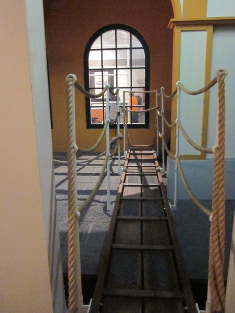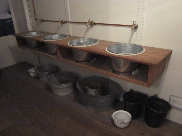 The third floor is unexpectedly educational. The Age of Steam is a series of rooms as a third-class passenger would have experienced them, starting with a walk along a plank to board the steamship, and once aboard, a sleeping bunk, the washroom (shown below at right), engine noise and a view of the sea out of the tiny porthole.