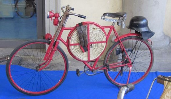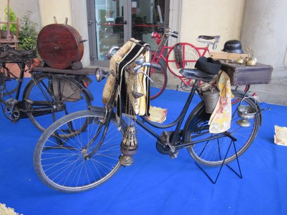 I find a book later in the day. “The Florentine Workshops on Wheels” by Luke Giannelli, looks at Florence of the early 20th century, and the bicycle as a working tool, used and reinvented according to the trade: knife sharpener, barber, shoemaker, postman, garbage collector, fireman, salesman. Each artisan of the time adapted to the needs of the case, making them, in our eyes, similar to real works of art.” If you can read Italian, here’s a website.