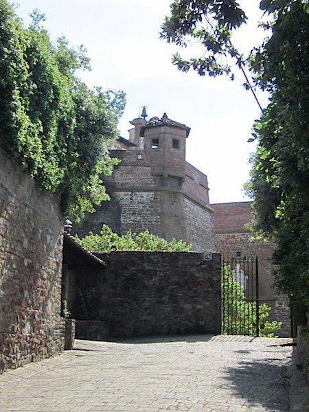 Iโm now looking for the Bardini Mansion that I saw advertised at the Pitti Palace. I stop at a grocer and buy a picnic lunch, which I enjoy in the solitude of the steps of an old fortress wall, which turns out to be the Belvedere Fortress which surrounds the Bardini mansion and its gardens.