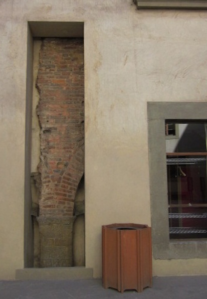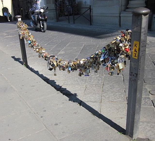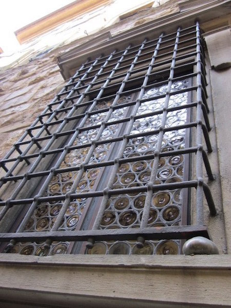 As I exit the garden and navigate back toward the Ponte Veccio. I see a number of cutaways in the stucco that expose the original parts of the building, an architectural feature that’s a fascinating way to preserve the original architecture. One of the “bottleglass” windows encased in a protective steel grate, and “love locks” near the Signum. These locks were originally on one of the bridges, but were moved to a plaza after the weight of them threatened to damage the bridge.
