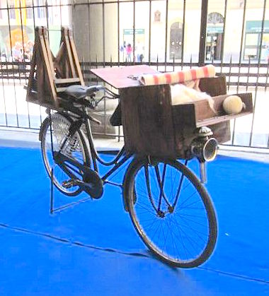Shown below are bikes for a priest (lower left), a photographer (center), and a wool processor (at right) with a cotton gin on the back, and a wooden box of roving which would be spun into yarn. Not shown here are a barber’s bike with its chest of shaving implements; a Cantastorie with a hurdy gurdy strapped to the front; and a portrait painter with paintbox on his handlebars and portrait samples over the back fenders. By the time I have finished my walk through Iโm laughing so hard Iโm nearly crying! Here are more of my photos from this exhibit.