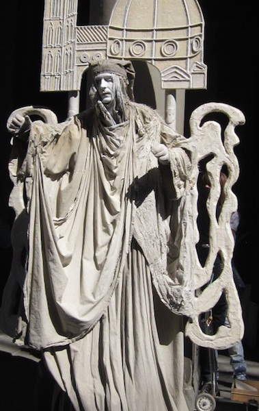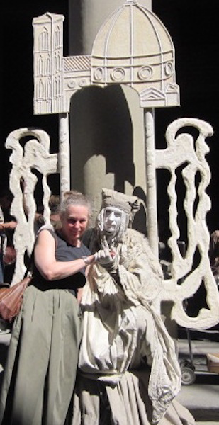 The Uffizi is hosting an exhibit of the works of DaVinci, and the lines are around the block. I look up to notice a โliving statueโ dressed as a cherub on the steps, posing for pictures. Heโs only the firstโฆ the next one is dressed as an Egyptian sarcophagi, the one after that a statue from the Duomo.