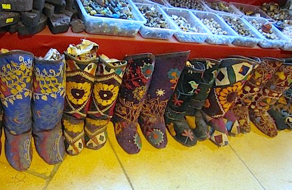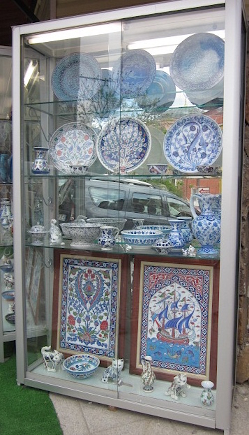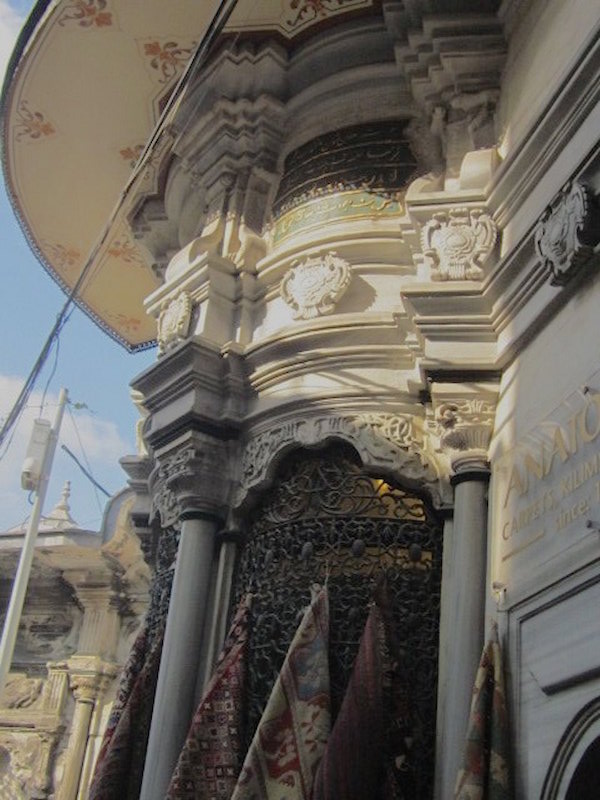 In addition to the shops that line some 60 walkways, this complex also houses two mosques, four fountains and a couple of bathhouses as well as several restaurants. Upon entering one of 27 doors, the first thing I see is a window filled with tiaras. Later on, a stall of embroidered boots and bins of beads and textile stamps. Beyond that, several shops filled with beautiful glass lanterns. A coat from the Topkapi Palace, replicated in blue and white porcelain, also catches my eye.