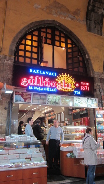 The Spice Bazaar is about the size of a single arm of the Great Bazaar, so I backtrack the way I came in, passing a finch in a shrink-wrapped cage, hanging in a doorway of a shop. What a clever idea. The bird stays out of drafts but can still see out, and passersby can see him and hear his happy little voice. I pass a baklava shop that has been here since 1871, and exit out into the street.