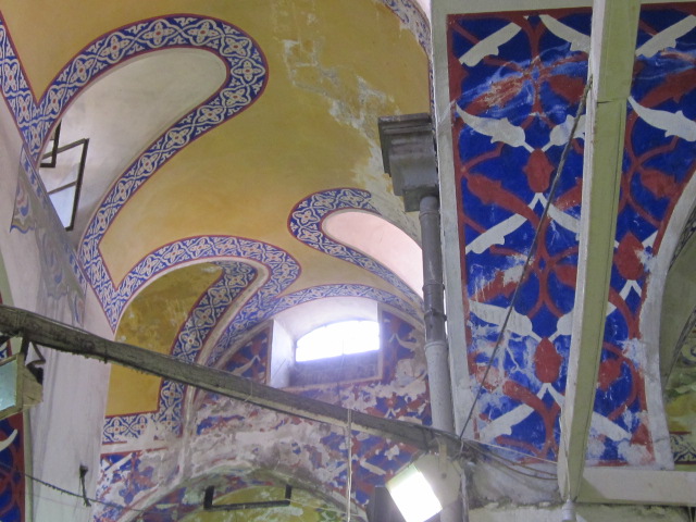 After passing the same teenager three times, which elicits flirts from him and subsequent smiles from me, I turn the corner and enter the Old Market. Here (lower left and center) the ceiling domes are exposed brick, and most of the shops are faced with glass cases. The wooden beamed ceiling (lower right) covers the area where the fine gold merchants are set up, and reminded me of the Ponte Veccio in Florence.