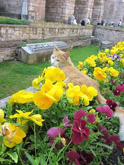 I exit the building, and recognize flying buttresses, installed to correct the dome when it started to lean. There’s a grassed in courtyard around the foundation of the Second Ayasofya, which was destroyed by fire in 532. The current Ayasofya is the third building to be raised on this site. I note what appear to be stone sarcophagi in the courtyard – a courtyard under the watchful eye of a tabby in repose among the blooms in an elevated garden. No trip to Istanbul is complete without at least one daily photo of the street and shop cats, who are well cared for here.