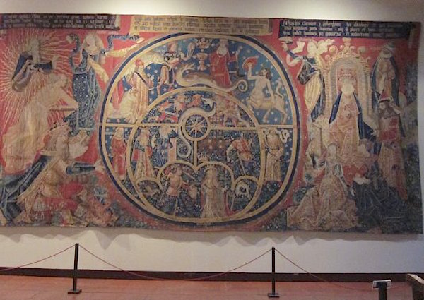 The piece I came to see here was the Tapestry of the Astrolabes. Woven in Belgium in 1480, it combines mythology and science to explain the divine world as it was perceived during the Middle Ages. It covers a wall, floor to ceiling and is about 12′ across – much larger than I thought it was. I spent about 20 minutes here, just trying to absorb all the details.