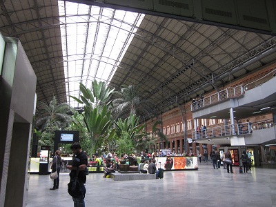 I board a city bus to the Madrid train station — a large, clean, modern multi-platform affair with large airport-style screens showing arrivals and departures. It’s pretty easy to navigate as long as you pay attention not only to your train number and gate, but also if your ticket says “Baha” (lower floor) or “Plata” (upper floor). I exchange USD for euros, and find a ledge to sit on, within sight of the reader boards. There are beautiful palm trees just outside of the double glass doors which I thought led outside.