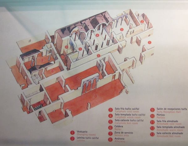 The informational placards (of which there are many) will tell you that the Baths had a perfect design, from the changing room where you would leave your clothes, to the Cold Room, where you would perform ablutions at the tiled fountain, and use the latrine. It is here that you would receive a cloth to wrap around your waist, and ‘alcorques’ – a pair of cork-soled sandals that would help you to avoid slipping or scalding your feet on the super-heated floor. Your next stop would be the Warm Room, a domed room where you would bathe. The original marble slab flooring is exposed.
