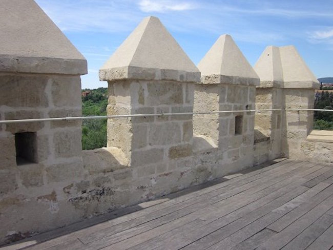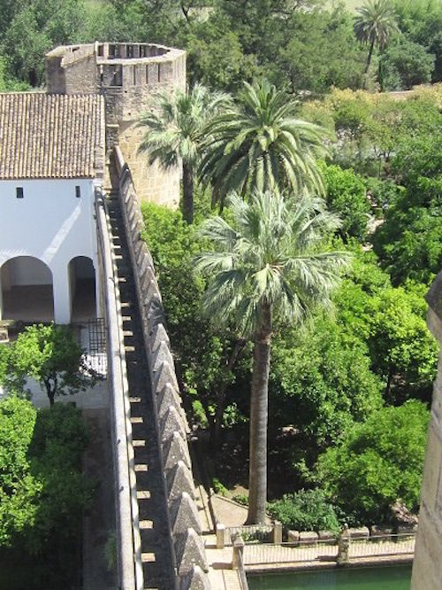 I climb a stone staircase to the roof where the view between the crenelations is far superior to that from the tower at the Roman Bridge. The photo at lower left shows the Alcazar gardens, on the other side of the wall from the common area of the city. The waterway shown at lower right is the color of split pea soup.