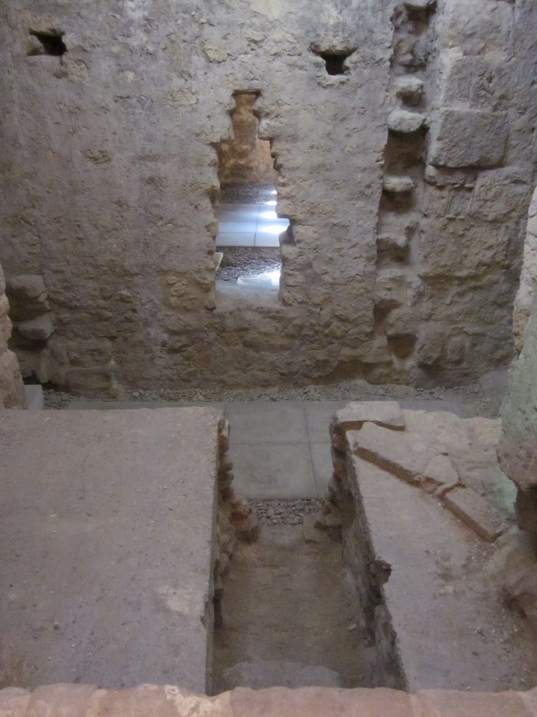 Across the street from the Alcazar are the Almohade Baths (the Caliph’s Baths), a partially restored ruin of royal baths. You enter a Reception Hall, built in the 10th century, when the Alcazar became the governor’s seat. There are traces of carved plaster in this room, with foiled arches, inscriptions, plant motifs, geometric decoration and mythological animals. In the center of this room there was once a fountain with a spout and basin, which may have been used as a reception hall or a ceremonial space by the governor of Cordoba between the 11th-14th centuries. It was also used by the kings of Castille.