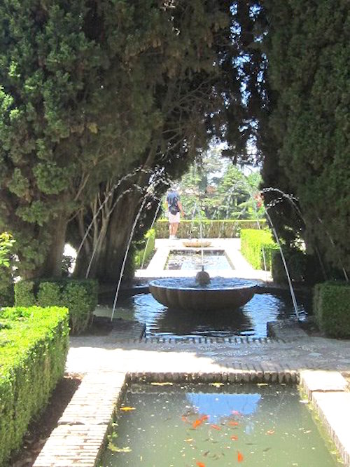 The Court of the Myrtles (shown below at left and named after the hedge that surrounds it) is also known as the Court of Alberca or Patio de la Acequia. It is an example of classic Granada architecture, and dates to the 19th century. The center photo below shows a fountain located in one of the arbors and surrounded by pools of goldfish. The photo at right shows an example of the hedges here that are pruned to such precision that the gardens in Florence were primitive in comparison.