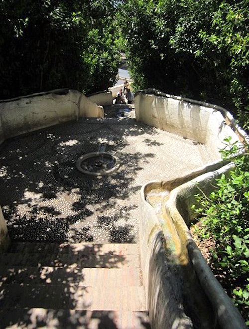 Beyond the Patio of the Sultana is the Water Stairway (shown below at left), dating to the 16th century. Under a canopy of bay trees, four sets of terraced stairs are linked by three landings, with a small fountain in the center. The stone handrails have channels carved into them that are filled with water that flows so fast that they create little whirlpools at the round joints. The sound of birds and water throughout the gardens is omnipresent, and at times, drowned out all other sound. I am impressed at how water is used in the gardens here (as well as in the Alcazar in Cordoba). It remains one of my favorite spots here.