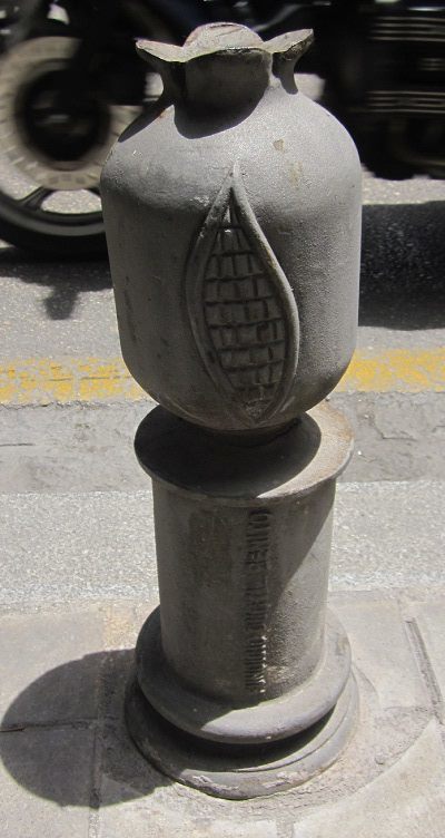 Thereās an open air spice market just outside of the Cathedral, in the Plaza de la Romanilla, where I buy tea and saffron, and sample candied aloe vera, which tastes sort of like green tea ice cream. I enter the Calle Reyes, a plaza filled with cafes and shops. I manage to find a sewing shop in almost every city I visit, and Granada is no exception. This one carries mostly embroidery yarns and flosses, needlework hoops on stands, and bolts of the rayon that mantilla fringe is made from. The pomegranate is the symbol of this city, and you will find versions of it everywhere. This is one of the concrete barriers that separates the street from the sidewalk. It looked more like a grenade or a torpedo to me. The last photo is a bronze statue titled: “Man with Donkey” which is dedicated to the men and women ‘aquadors’ who came into the city to sell fresh water, I presume gathered from the mountain springs.