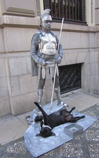 I had encountered living statue street performers in Florence, and find one here as well. This one is a Roman soldier who becomes animated (and his dog who lays dead) when you toss coins in his box. I watch him for awhile before heading to the Cathedral, running a gauntlet of gypsies so numerous and aggressive that their attempts to exchange their sprigs of rosemary for coin becomes a contact sport. I think I should have hired the Roman as a bodyguardā¦