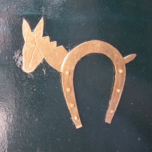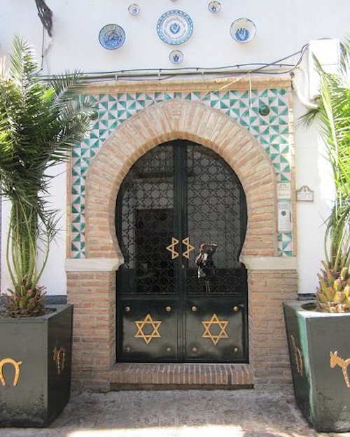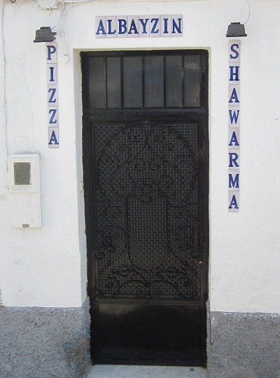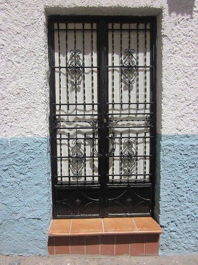 There’s a path of blue plastic sheeting laid out on the cobblestones that seems to be an art installation, running from San Nicolas Square to some unrecognizable stopping point. I follow it and discover a chapel (lower left) built into a wall that is all that remains of the original Fortress of Granada that pre-dates the Alhambra. I find a synagogue which is also closed, with curious brass horseshoe-donkey motifs on the planters on each side of the door. I stop to photograph a couple of other doors, one that cracked me up with its ‘pizza and shawarma’ offering, the other with iron grillwork that is nearly identical to my front door at home. It would inspire me to do a Spanish inspired make-over of my front porch later that summer.