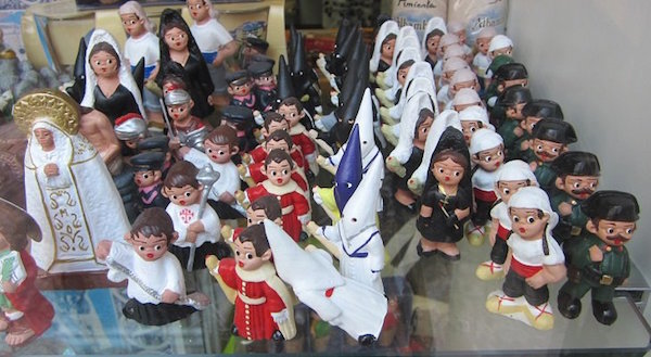 A farmers’ market is in full swing today. I find a shop window full of small doll-like religious figures. The white hooded figures at center look like KKK but are actually inquisitors, among other church themed figurines. It struck me as really odd, given how gruesome the Inquisition was in Granada.