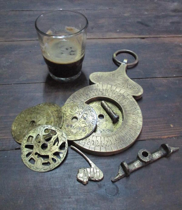 His name is Abdamin. He invites me into his antique store and tells me he has a girlfriend in Tacoma.  After some social banter, I take a look around.  Here’s a pile of prayer rugs like what I was looking for in Istanbul.  He pulls half a dozen from the stack and lays them out on the floor, and makes me circle around them until I choose one.  I also choose a smaller square one from another pile, that Abdamin says are for laying your head on when you sleep.  While he’s fetching me a glass of coffee to seal the deal, I look around again, and find an astrolabe in a corner cabinet.  I had looked all over Florence and Istanbul for one of these, after visiting the science museums in both cities.  What a bizarre thing to find in this mountain city…