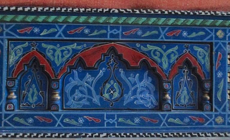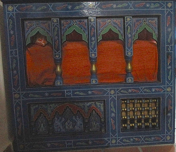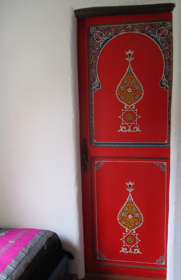 We pull into a steep drive and check into the Al Khalifa Hotel, on a hill overlooking the city.  The rooms are simple but efficient, and the red painted furniture is striking against the blue-washed walls.  It feels very Himalayan, but the manager assures me that the motifs are Arabic-Moroccan, painted by a local artist.
