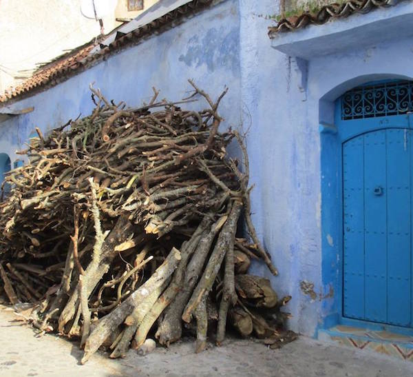 I walk down the pale blue staircase towards the town square, immersed in a soundscape of rushing water, and the pastoral bleats of goats and sheep.  There’s a waterfall near the Hotel Khalifa – the Ras el Maa – a water source for Chefchaouen that literally roars out of the mountains.  I cross the bridge to admire the sound and the view. Further upstream are wooden structures with roofs but no sides – washing sheds where the townswomen come to do their laundry, and wash fleeces prior to processing the wool into yarns for weaving.  I pass one of the community bake houses, built in the mid-1500’s.  There are no ovens in the homes in town, it’s too much of a fire hazard, so women bring trays of bread dough, covered with linen towels, to be baked in the wood fired ovens.