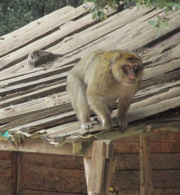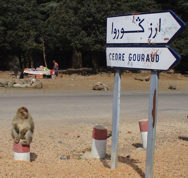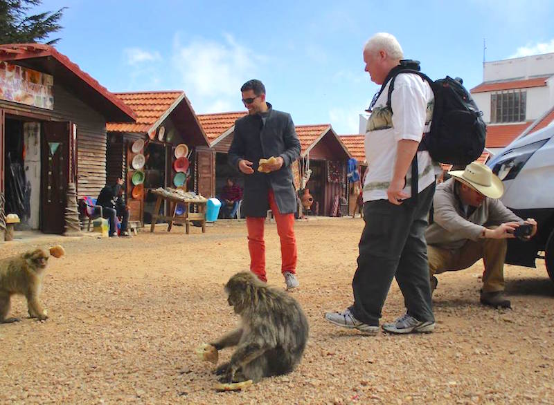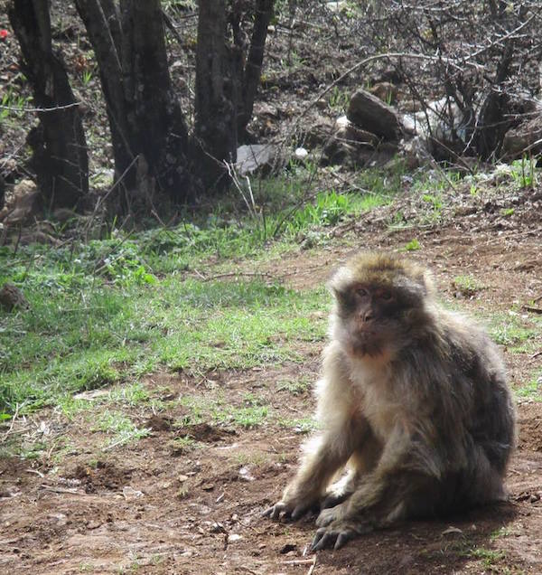 We climb into the Middle Atlas Mountains and reach Azrou, in the heart of the Forest of Cedars. Doug tells us to start watching for monkeys, and no sooner does he say the word “monkey” than we start seeing them come down out of the trees. We pull over and park, and are soon surrounded.