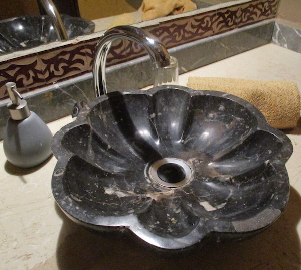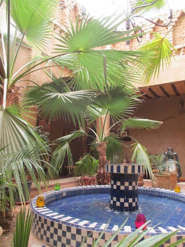 I wish I could capture the sounds and smells of this place, as I sit at the edge of one of the fountain courtyards, tea in hand, incense wafting over me… above my head an iron chandelier, with palms and birds… waitstaff wearing the blue and gold caftan that the men wear here, smiling at me as they light incense in the four corners of the courtyard.