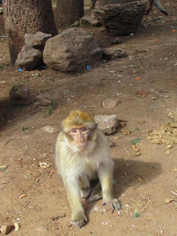 These are macaques (Barbary Apes) – indigenous to the mountain forests of Morocco and Algeria, and with only a few thousand left in the wild. They are twice the size I was expecting, and docile, except for the Leader of the Pack, which the locals point to, with a warning to keep clear. A young guide comes up to me with a handful of broken up crackers, and motions to me to hold out my hand and wait for the monkey to come to me.