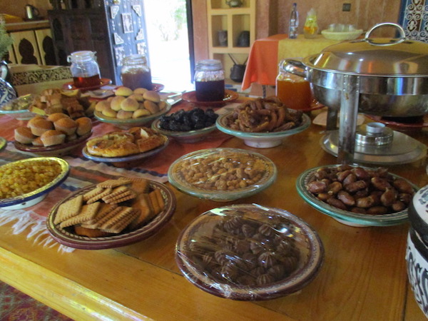 The buffet offers whatever you want to eat – as long as it is some form of bread! There’s chorizo soaked in honey, and little chocolate stardrop cookies, hard rolls, soft breads, and deep fried chickpeas rolled in sesame seeds. Hard boiled eggs, cheese wedges and two styles of peanuts offer some protein. The mint tea here is not as syrupy-sweet as what we had been served up to this point, and is poured into glasses that each have a fresh sprig of mint. I drink several helpings out of an ornate tea glass.