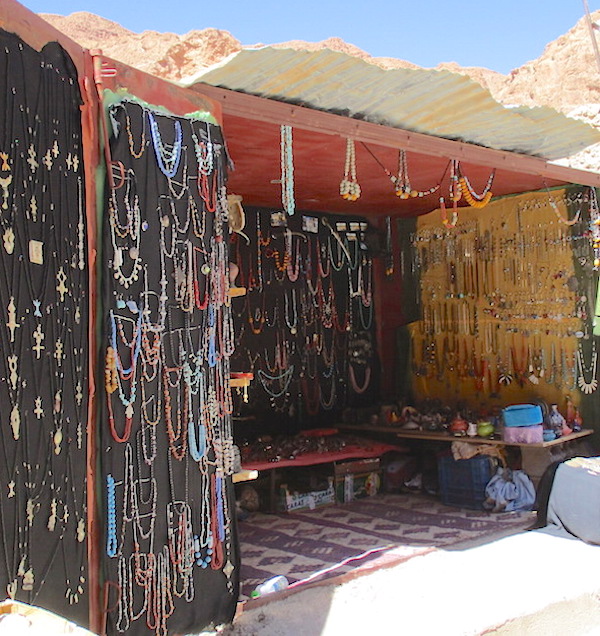 I reach the end of the paved road and take a goat trail part of the way back, putting me above the merchant stalls but below caves with stairways carved into the rock, that appear to be inhabited. There are two nomadic tribes who rendezvous at Saturday market here … the Haddidou and the Merghad. The area was also once inhabited by a Jewish population. Today the gorge is lined with carpet hawkers and jewelry vendors. There’s a hotel nestled at one end, and merchants set up along the other side, some with locking cases.