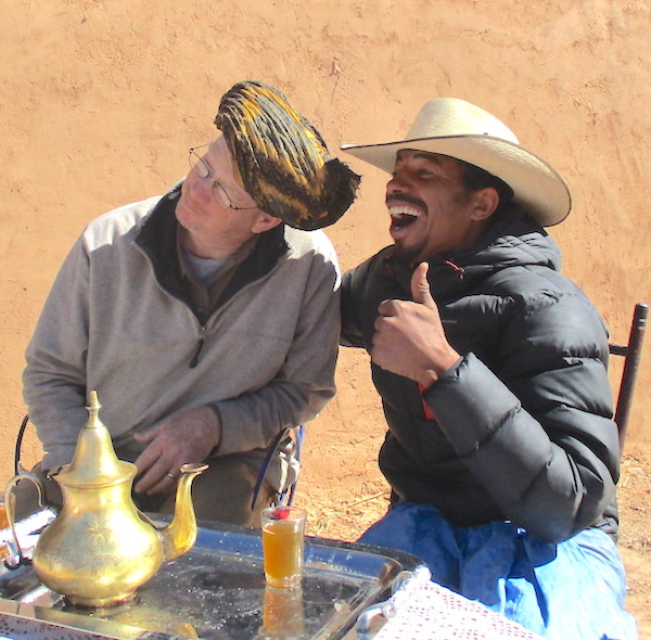 We return to Said’s home the next day for mid-morning tea, and to visit his camels which are tethered as a road side attraction and photo op for passing tourists. His home offers a beautiful panoramic view of a patchwork of fields in the valley, overlooked by one of the many kasbahs in this area. (The group shot with the camel is courtesy of Mark Charteris.)