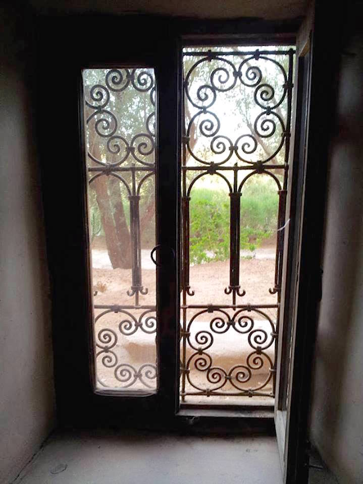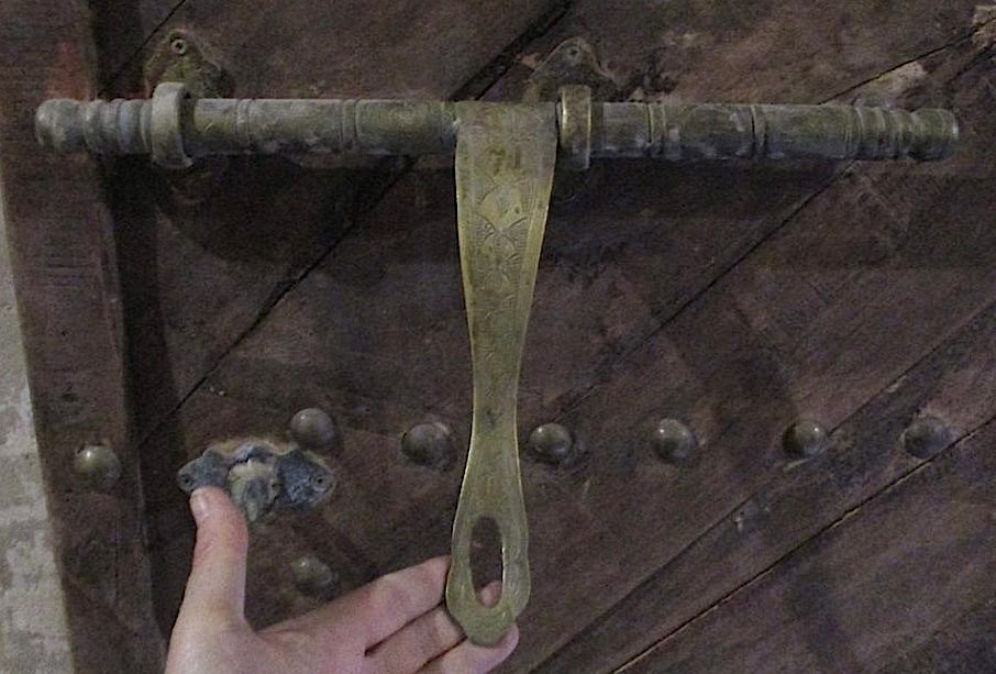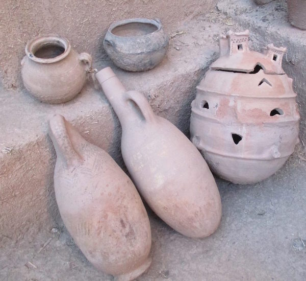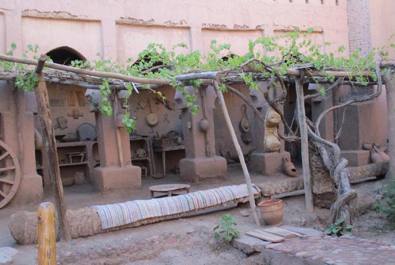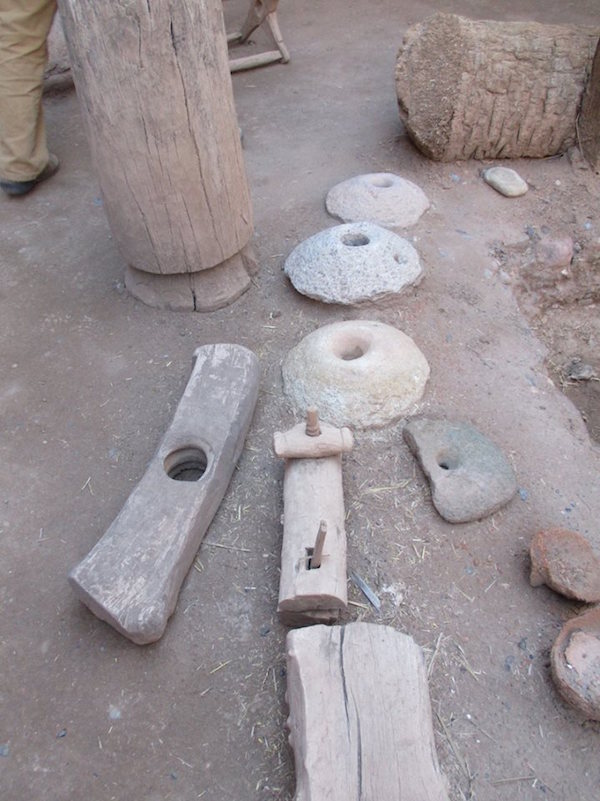 This 17th century citadel is primarily a museum, and one of the most famous buildings in Morocco, even being featured on the old 50 dirham note. Some scenes from ‘Laurence of Arabia’ were filmed here. We meet another guide, who walks us through an entrance in the ornate walls, and starts our tour in a courtyard filled with artifacts which include an olive press, several clay cook pots and lanterns, and a form used for making the rammed earth walls. selects a guide, who starts our tour in a courtyard filled with artifacts which include an olive press, clay cook pots and lanterns, and a form used for making the rammed earth walls.