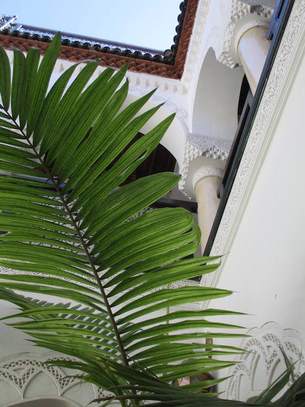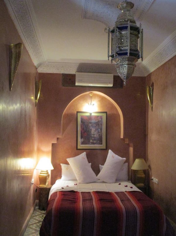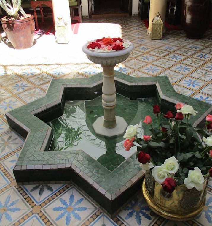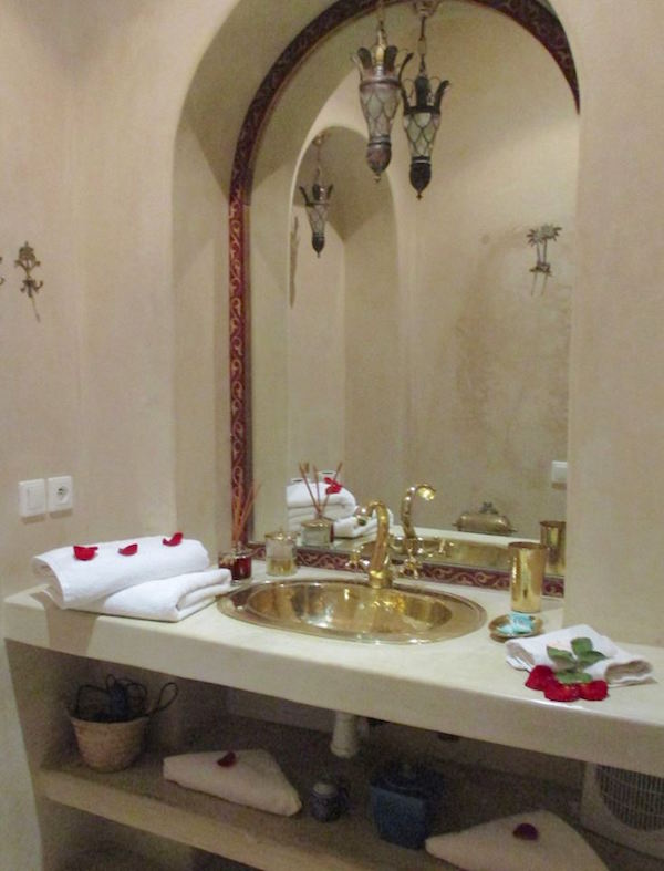 Unbelievable!   Having just checked out of the Palais des Roses, we find ourselves in a true palace of roses โ€ฆ there are rose petals scattered everywhere in our rooms! Thereโ€™s another tray of sweets and fruit on the small wooden table, along with a welcome bottle of water.  Once again, I am struck by the stark differences in hospitality between the large hotels โ€“ which didnโ€™t even have water or menus in the rooms โ€“ and the riads which see to every potential need, even those that you didnโ€™t realize you had โ€ฆ