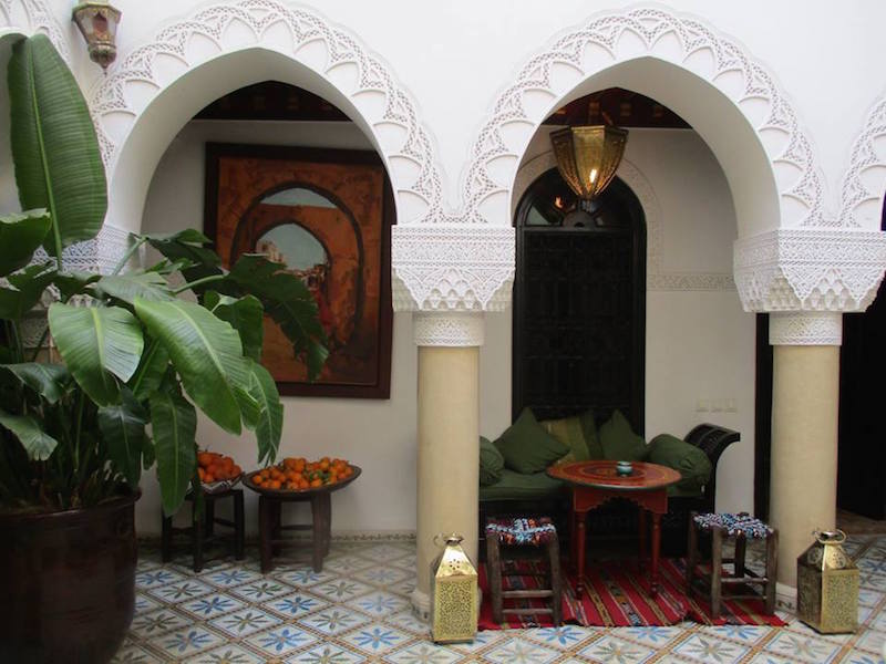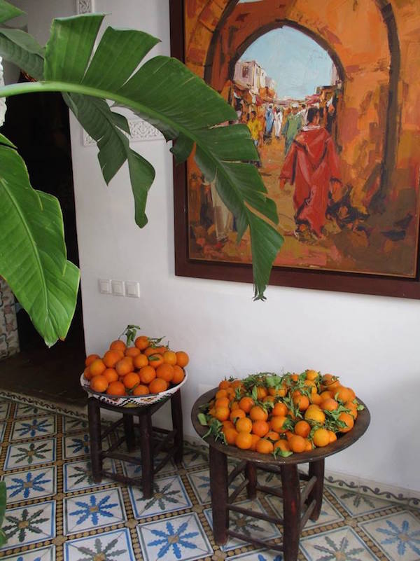 We are met in the courtyard with tea and a tray of sweets, and seated on cushions around a center fountain filled with rose petals. I take note of the vases of roses and huge bowls of oranges in the corners of the courtyard.  I start nibbling on a second cookie when we are ushered to our rooms.