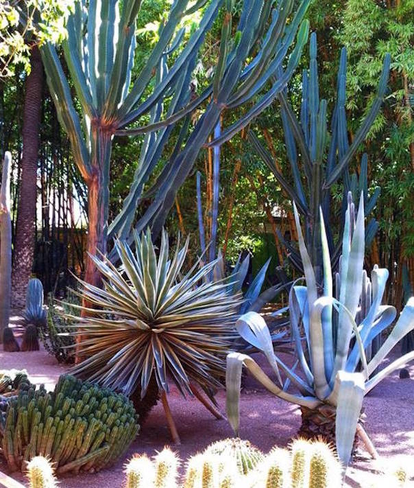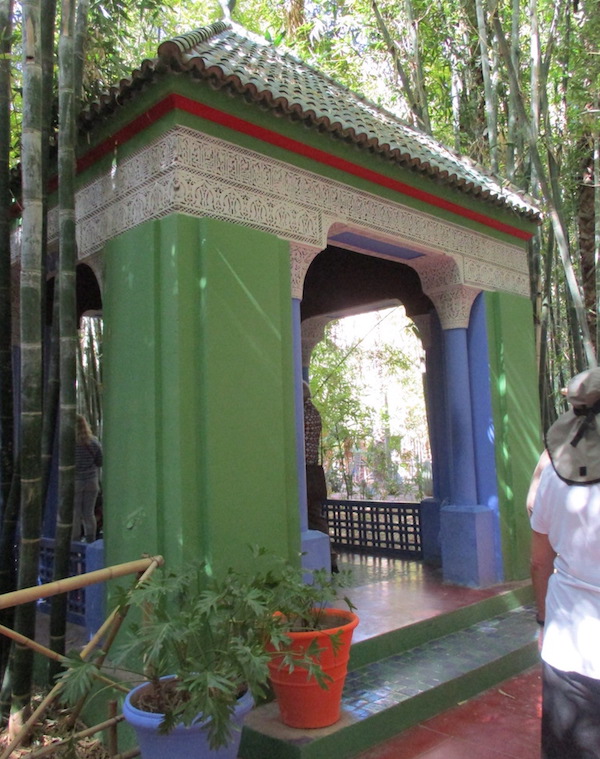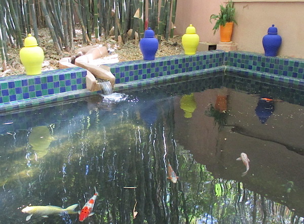 We only have the briefest time to enjoy this opulance before visiting the Majorelle Gardens. This thematic garden surrounds a villa that was built in the 1920โ€™s for Jacques Majorelle (a French Orientalist painter). The property was purchased in 1980 by Yves Saint Laurent and his partner Pierre Berge, who turned the villa into a museum, and also restored the gardens. (Click here for some history.) I did not find the gardens โ€˜breathtakingโ€™ as the guidebooks will tell you, but it did contain some interesting cacti in sterile and oddly colored plantings.  I found the color scheme to be somewhat garish, in its green, blue, yellow and oranges, with even the fish in the pond seemingly matching the scheme.